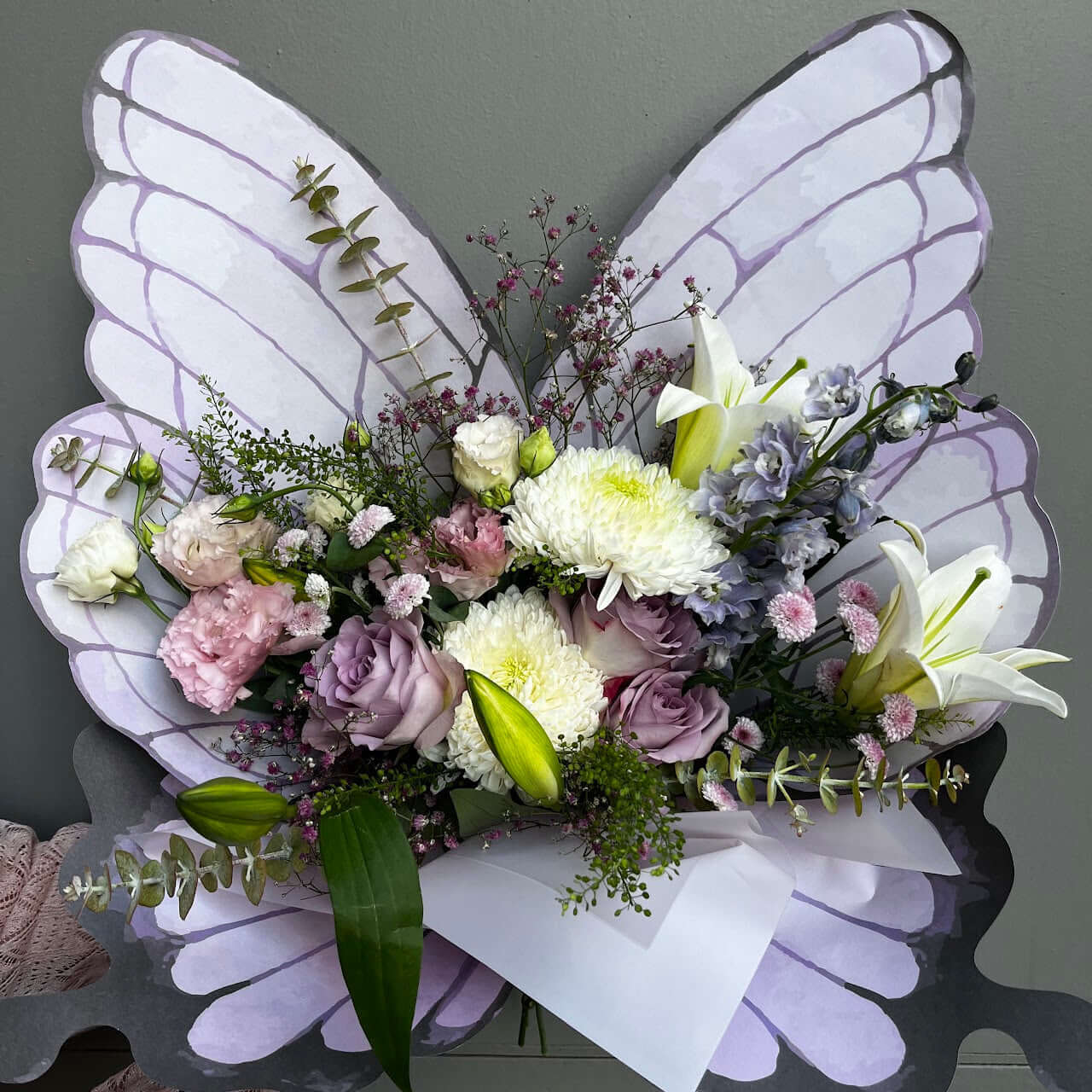 Bu çiçek tasarımı, zarafeti ve hayal gücünü bir araya getirerek adeta bir masal diyarından kopup gelen büyüleyici bir esinti sunuyor. Kelebek kanatlarını andıran detaylı tasarım, aranjmanı sadece bir çiçek düzenlemesi değil, aynı zamanda bir sanat eseri haline getiriyor. Lila güllerin naifliği, beyaz zambakların asilliği ve mor tonlardaki çiçeklerin sofistike havası, bu düzenlemeye bir peri masalı hissi katıyor. Bu çiçek aranjmanı, hem estetik hem de duygusal bir ifade olarak sevdiklerinize özel bir hediye sunmanın en etkileyici yollarından biri.