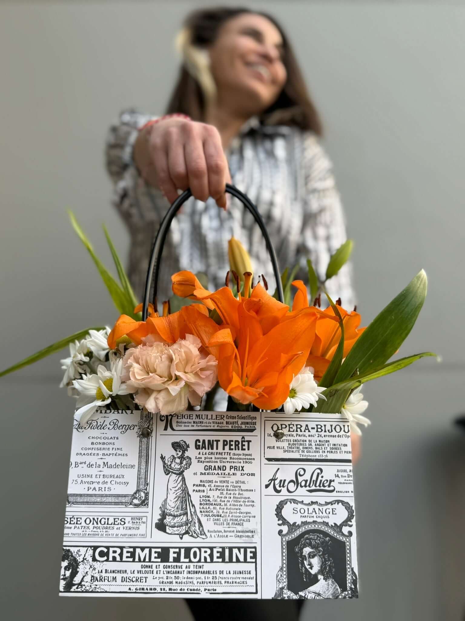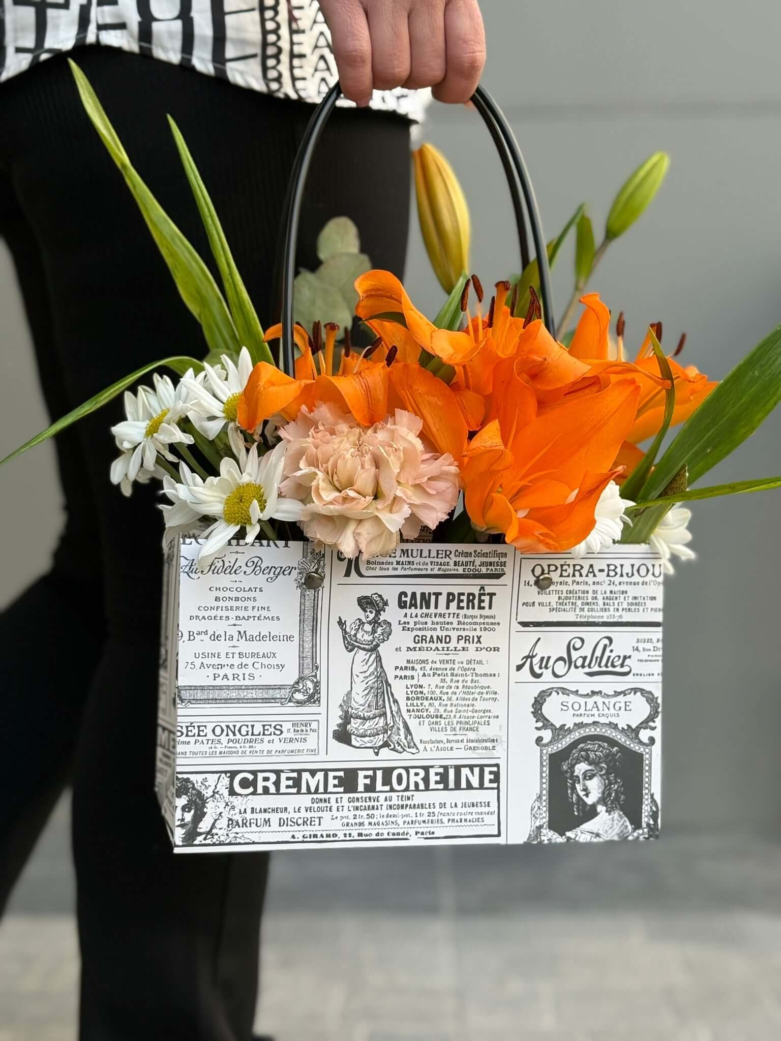 Mevsim çiçekleriyle oluşturulan şık çanta tasarımı ister özel gün ister içinizden geldiği her an sevdiklerinizi mutlu etmenin bir başka şekli.