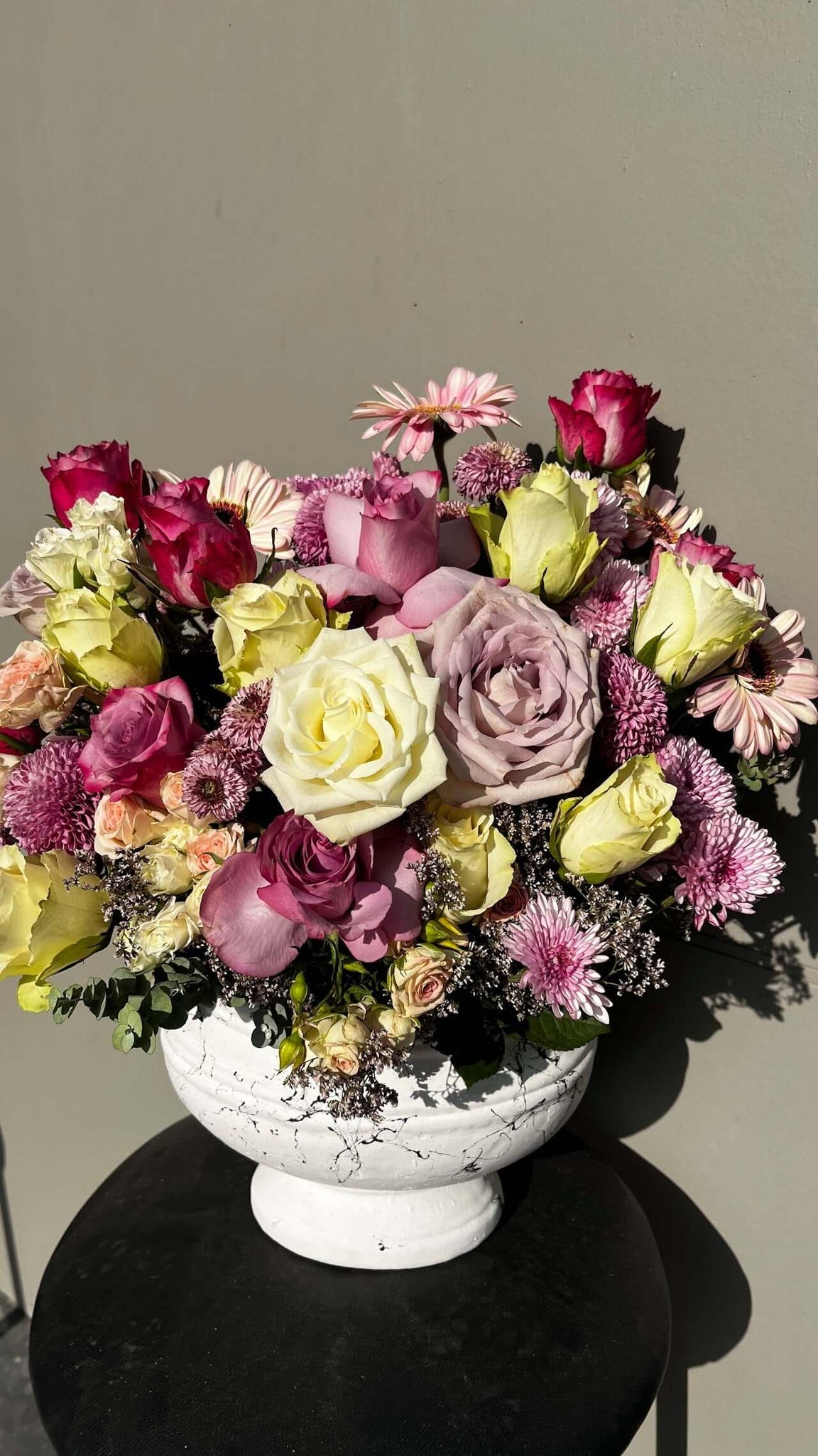 Pembe, mor, krem ve beyaz tonlarında seçkin güller, sadeliğiyle büyüleyen krizantemler ve ince detaylarıyla dikkat çeken papatyalar bu aranjmanda buluşuyor. Her bir çiçek, doğanın güzelliğini ve zarafetini en saf haliyle yansıtırken, kullanılan yeşil dokular kompozisyona tazelik ve canlılık katıyor.