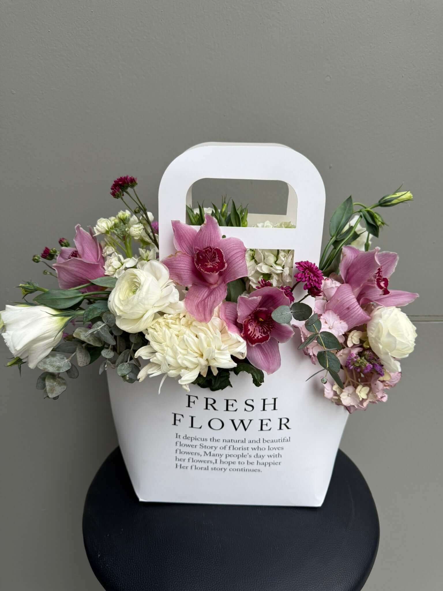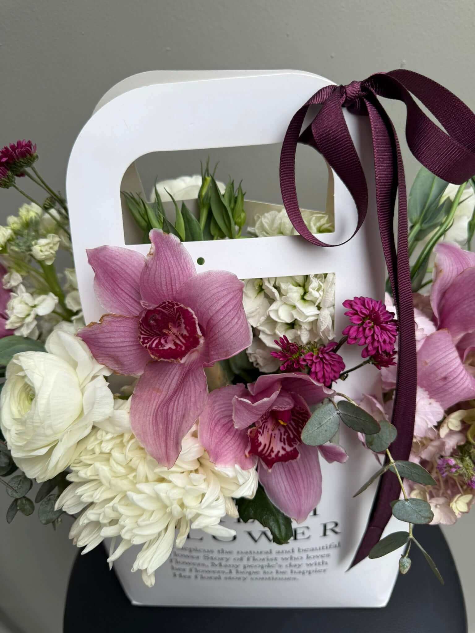 Orkide şebboy anastasia ve mevsim çiçeklerinden oluşan şık çanta aranjmanımızla göz doldurun.