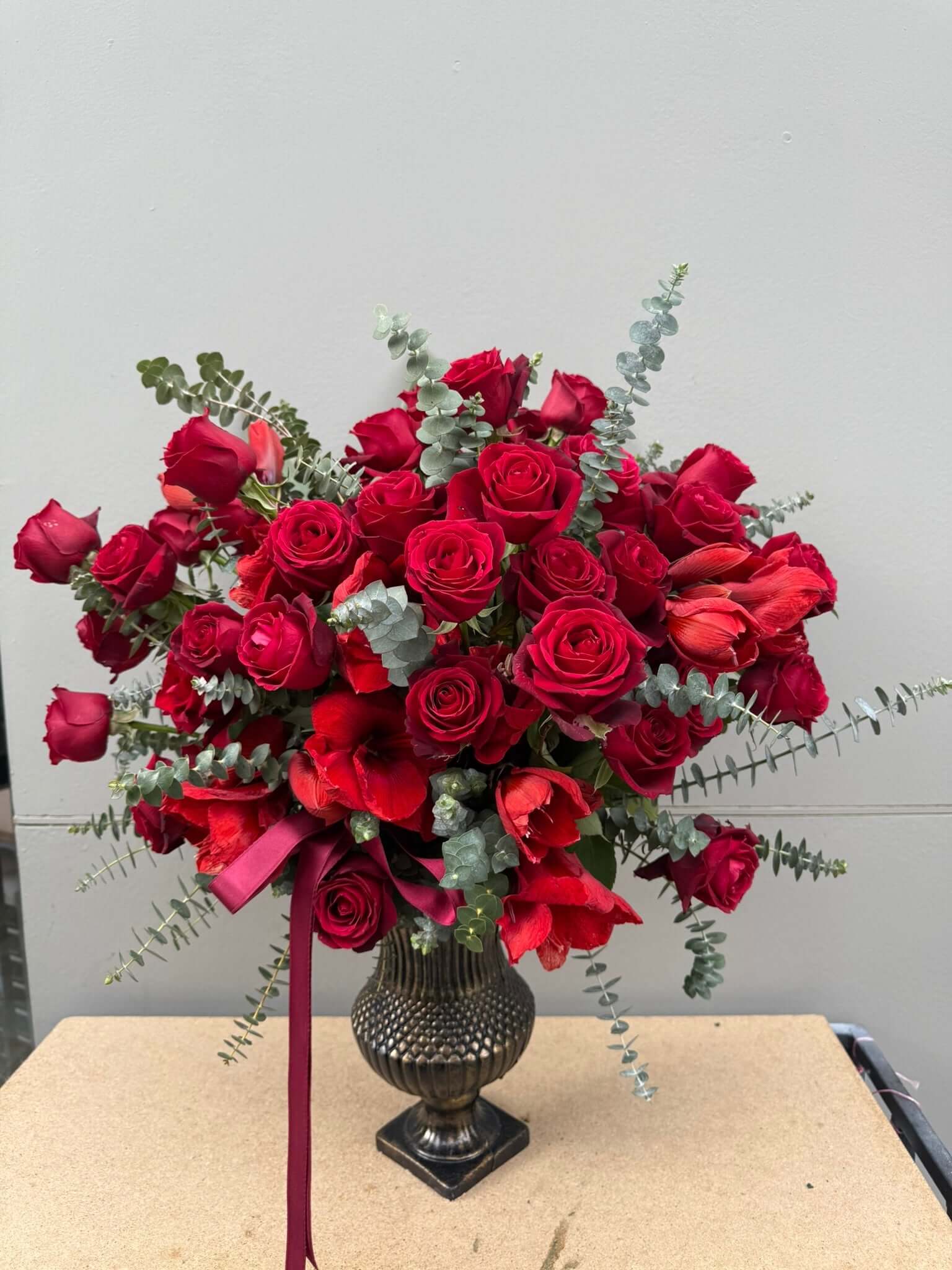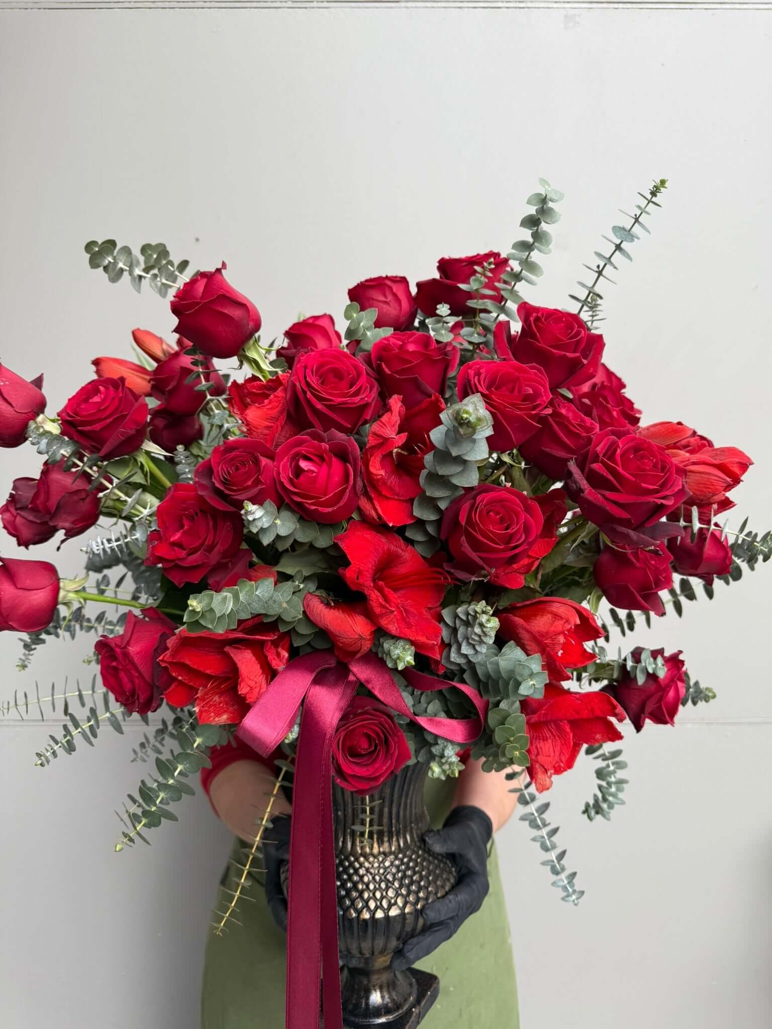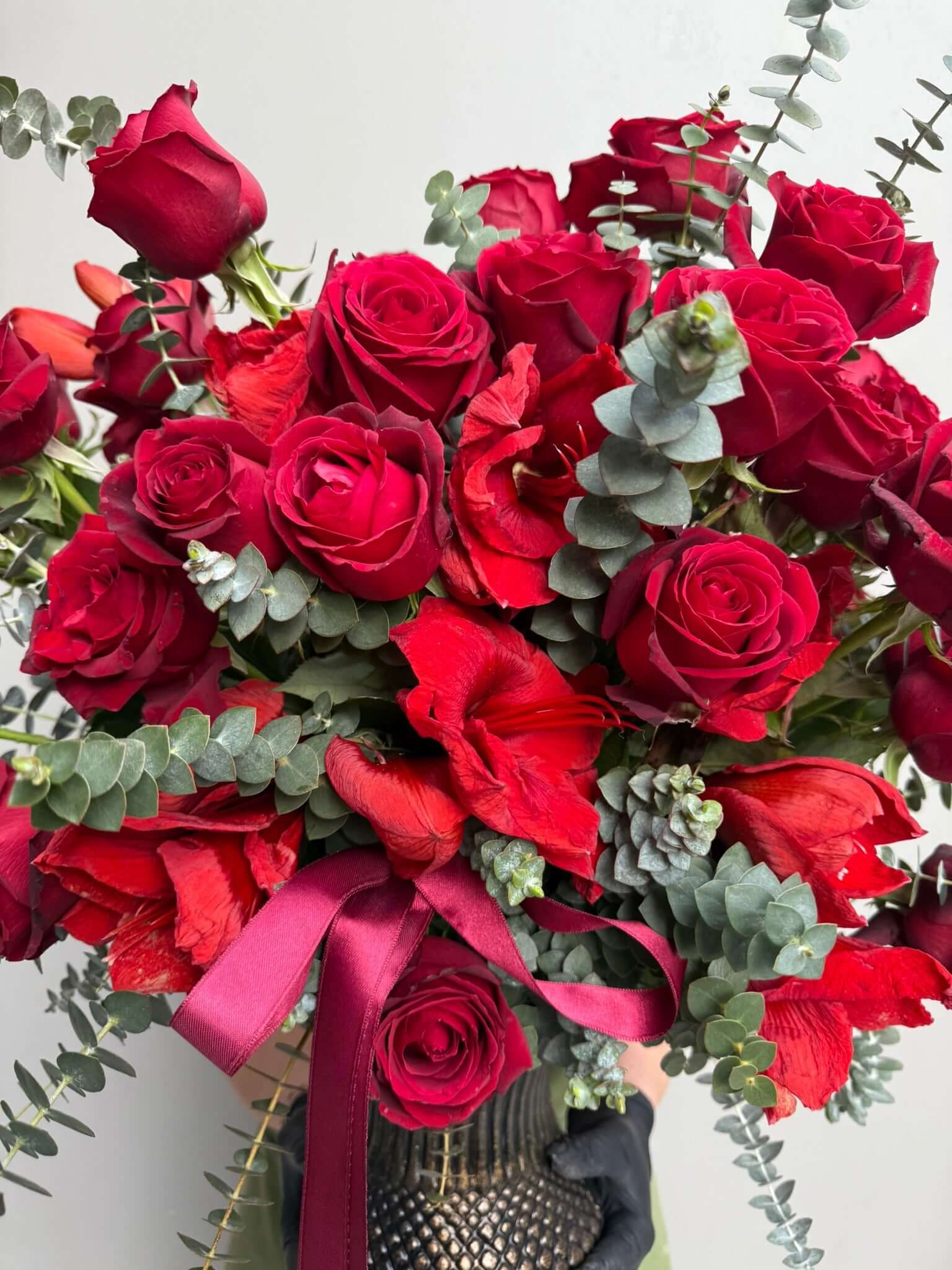 Aşkın en güzel hali, zarafetin en asil tonu. Kırmızı güllerin eşsiz cazibesi ve okaliptüsün ferahlığıyla tasarladığımız bu aranjman, duygularınızı en şık şekilde ifade etmenin anahtarı.